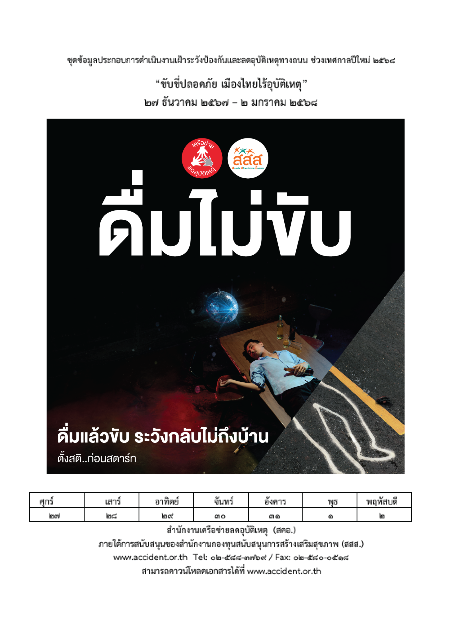 สำนักงานเครือข่ายลดอุบัติเหตุ (สคอ.) ภายใต้การสนับสนุนของสำนักงานกองทุนสนับสนุนการสร้างเสริมสุขภาพ (สสส.) ---------- ตั้งสติ..ก่อนสตาร์ท ----------- ลดเร็ว ลดเสี่ยง -:- ดื่มไม่ขับ --- ขับไม่ซิ่ง --- ง่วงไม่ขับ -:-