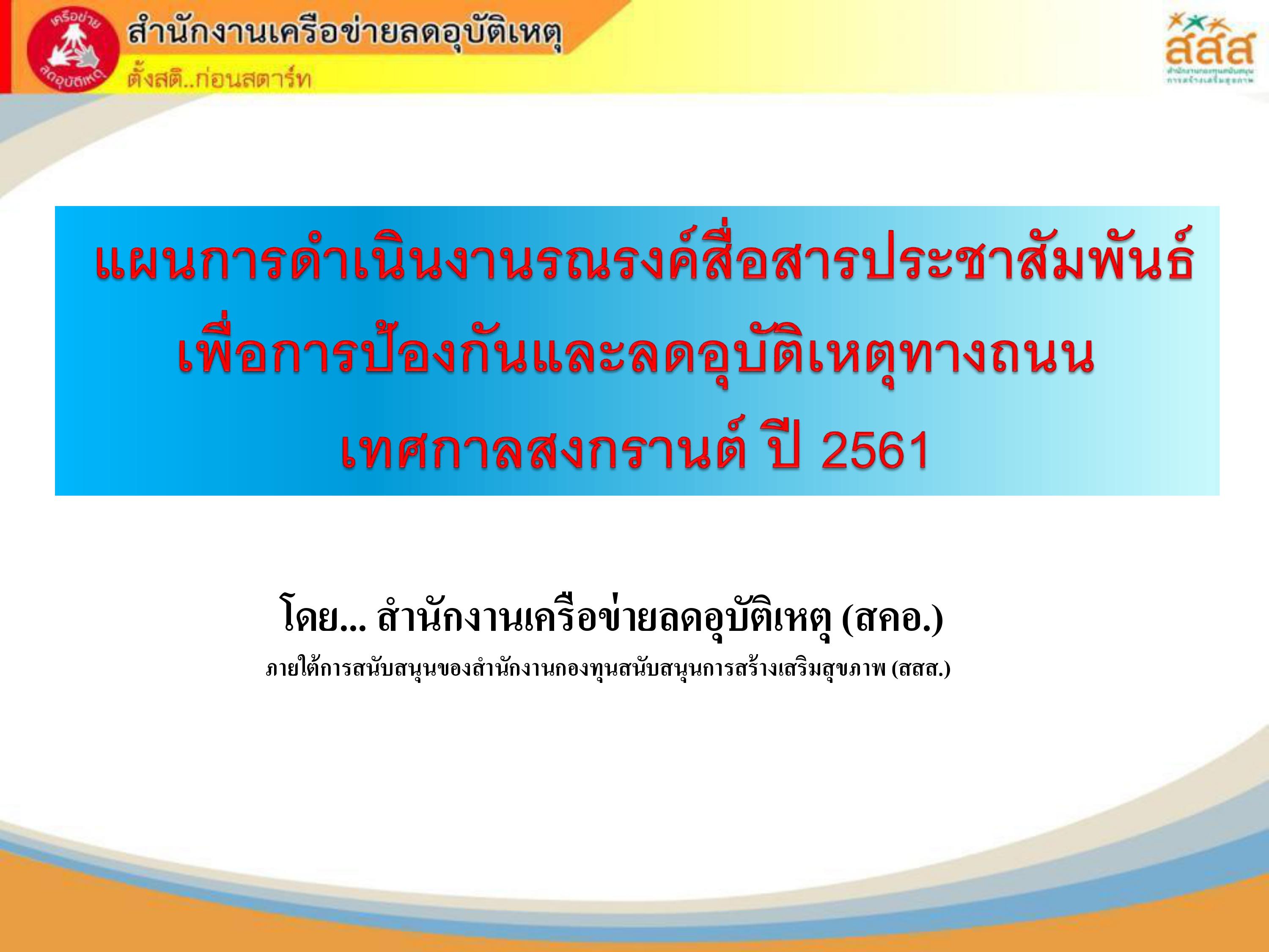 สำนักงานเครือข่ายลดอุบัติเหตุ (สคอ.) ภายใต้การสนับสนุนของสำนักงานกองทุนสนับสนุนการสร้างเสริมสุขภาพ (สสส.) ---------- ตั้งสติ..ก่อนสตาร์ท ----------- ลดเร็ว ลดเสี่ยง -:- ดื่มไม่ขับ --- ขับไม่ซิ่ง --- ง่วงไม่ขับ -:-