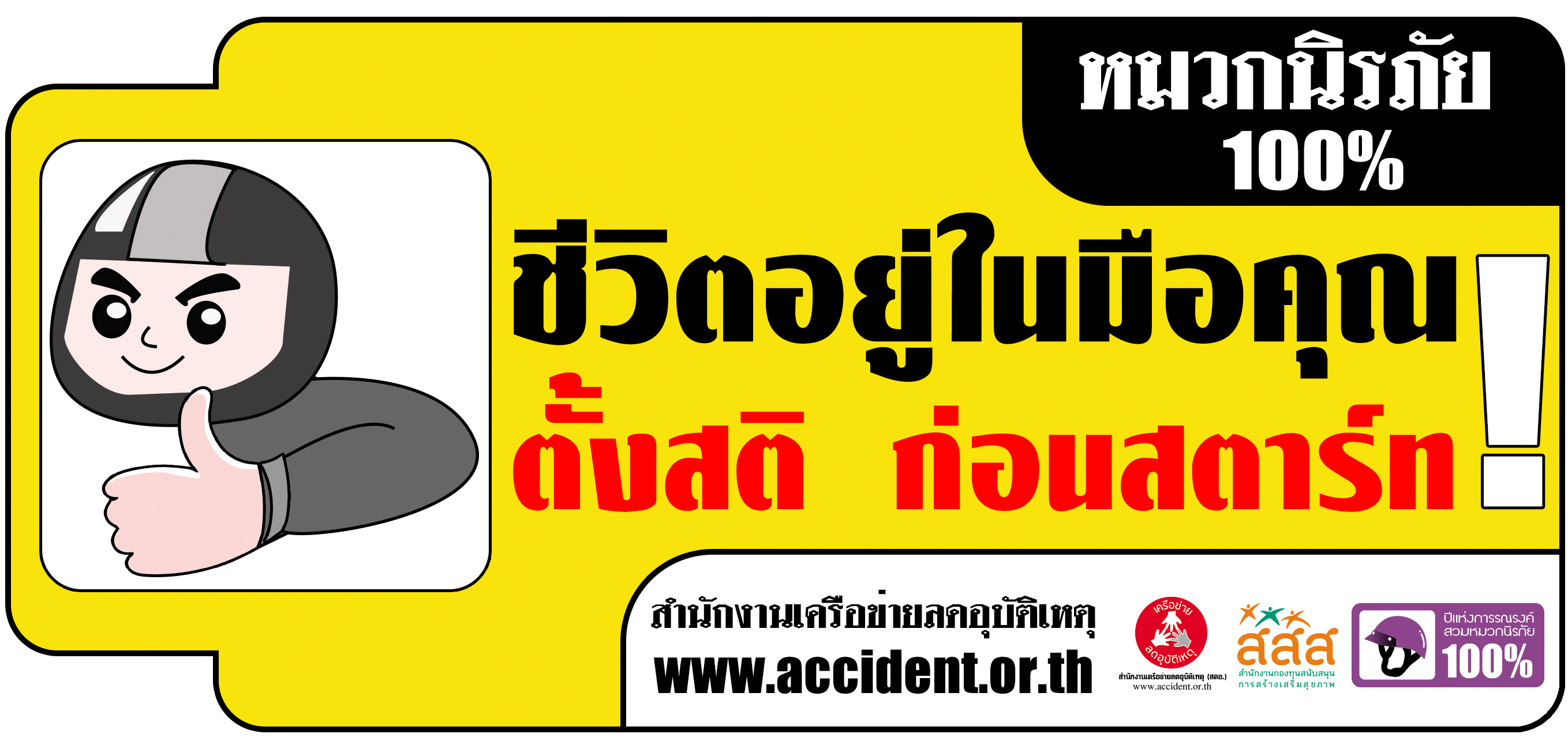 สำนักงานเครือข่ายลดอุบัติเหตุ (สคอ.) ภายใต้การสนับสนุนของสำนักงานกองทุนสนับสนุนการสร้างเสริมสุขภาพ (สสส.) ---------- ตั้งสติ..ก่อนสตาร์ท ----------- ลดเร็ว ลดเสี่ยง -:- ดื่มไม่ขับ --- ขับไม่ซิ่ง --- ง่วงไม่ขับ -:-