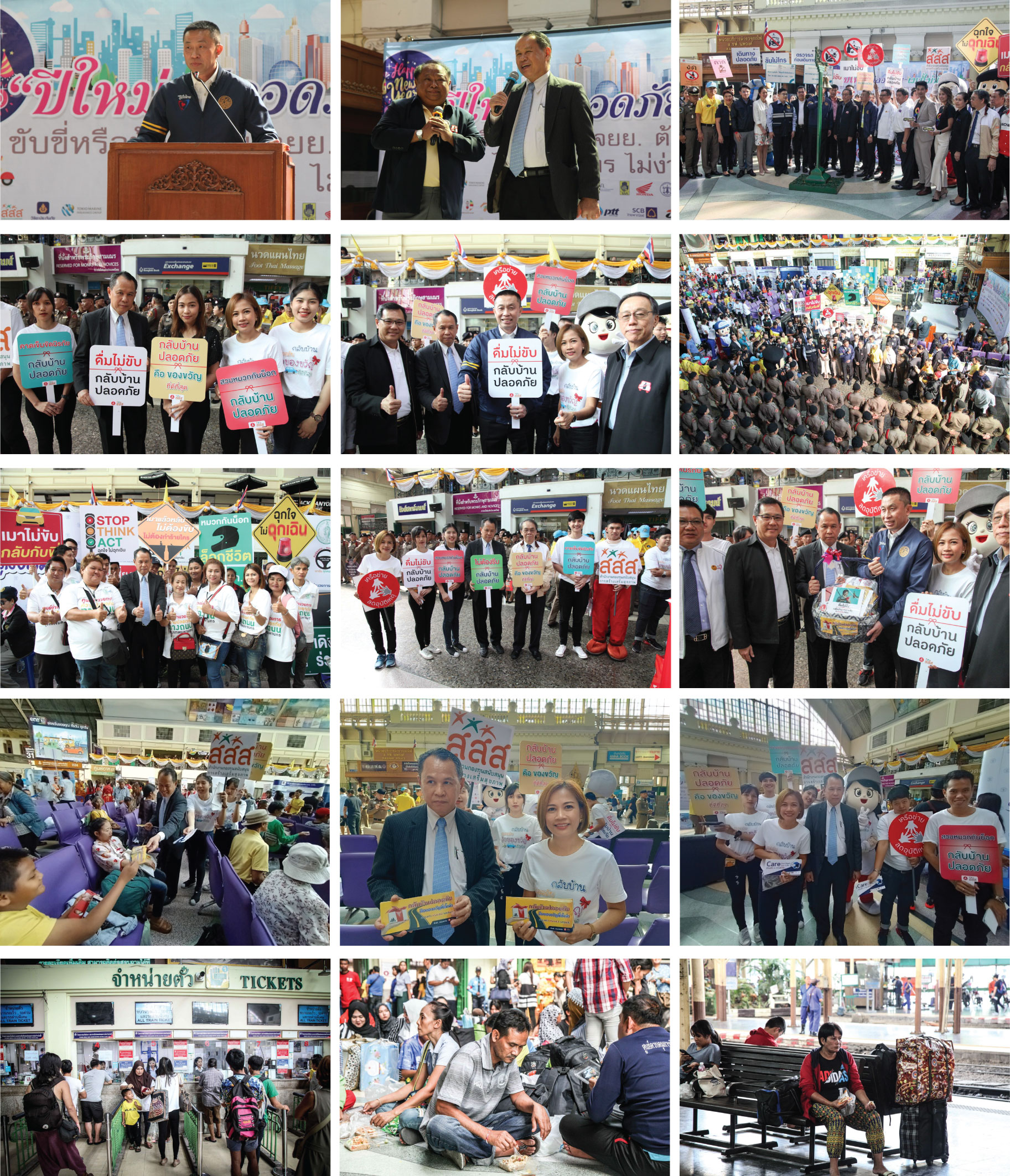 ปีใหม่ปลอดภัย “ดื่มไม่ขับ” ( วันที่ 27 ธ.ค.62 ) ณ สถานีหัวลำโพง กทม. – มูลนิธิเมาไม่ขับร่วมกับการรถไผแห่งประเทศไทยและภาคีเครือข่ายรณรงค์ลดอุบัติเหตุภาครัฐ เอกชน จัดกิจกรรมรณรงค์ลดอุบัติเหตุ “ ปีใหม่ปลอดภัย เมาไม่ขับ” โดยมี นายศักดิ์สยาม ชิดชอบ รัฐมนตรีว่าการกระทรวงคมนาคม เป็นประธานเปิดงาน พร้อมกล่าวว่า ความปลอดภัยในการเดินทางคือหัวใจสำคัญ กระทรวงคมนาคมจึงกำหนดมาตรการให้ผู้ขับขี่ทั้งรถสาธารณทุกประเภท ทั้ง รถไฟ บขส. รถ ขสมก. รถตู้โดยสาร จะต้องปลอดแอลกอฮอล์อย่างเด็ดขาด หากฝ่าฝืนจะลงโทษสถานหนักถึงขั้นไล่ออก ให้ออก ตัดเงินเดือนหรือพักงาน ทั้งนี้กิจกรรมภายในงาน มีบูธภาคีเครือข่ายร่วมรณรงค์ เพื่อให้ความรู้ประชาชน เรื่องอันตรายจากเครื่องดื่มแอลกอฮอล์ มีการแจกสื่อสติกเกอร์ แผ่นพับ คู่มือการเดินทางปีใหม่ให้กับผู้โดยสารที่รอขึ้นรถที่สถานีรถไปหัวลำโพงด้วย ในการนี้ นายพรหมมินทร์ กัณธิยะ ผู้อำนวยการสำนักงานเครือข่ายลดอุบัติเหตุ (สคอ) นำทีมเยาวชนรณรงค์มอบกระเช้าสื่อรณรงค์ ดื่มไม่ขับ-คาดเข็มขัดนิรภัย-สวมหมวกกันน๊อค “กลับบ้านปลอดภัยคือของขวัญที่ดีที่สุด” แก่ประธาน และได้เดินรณรงค์แจกสื่อและให้ข้อมูลการเดินทางปลอดภัยแก่ประชาชนที่มารอรถไฟอีด้วย